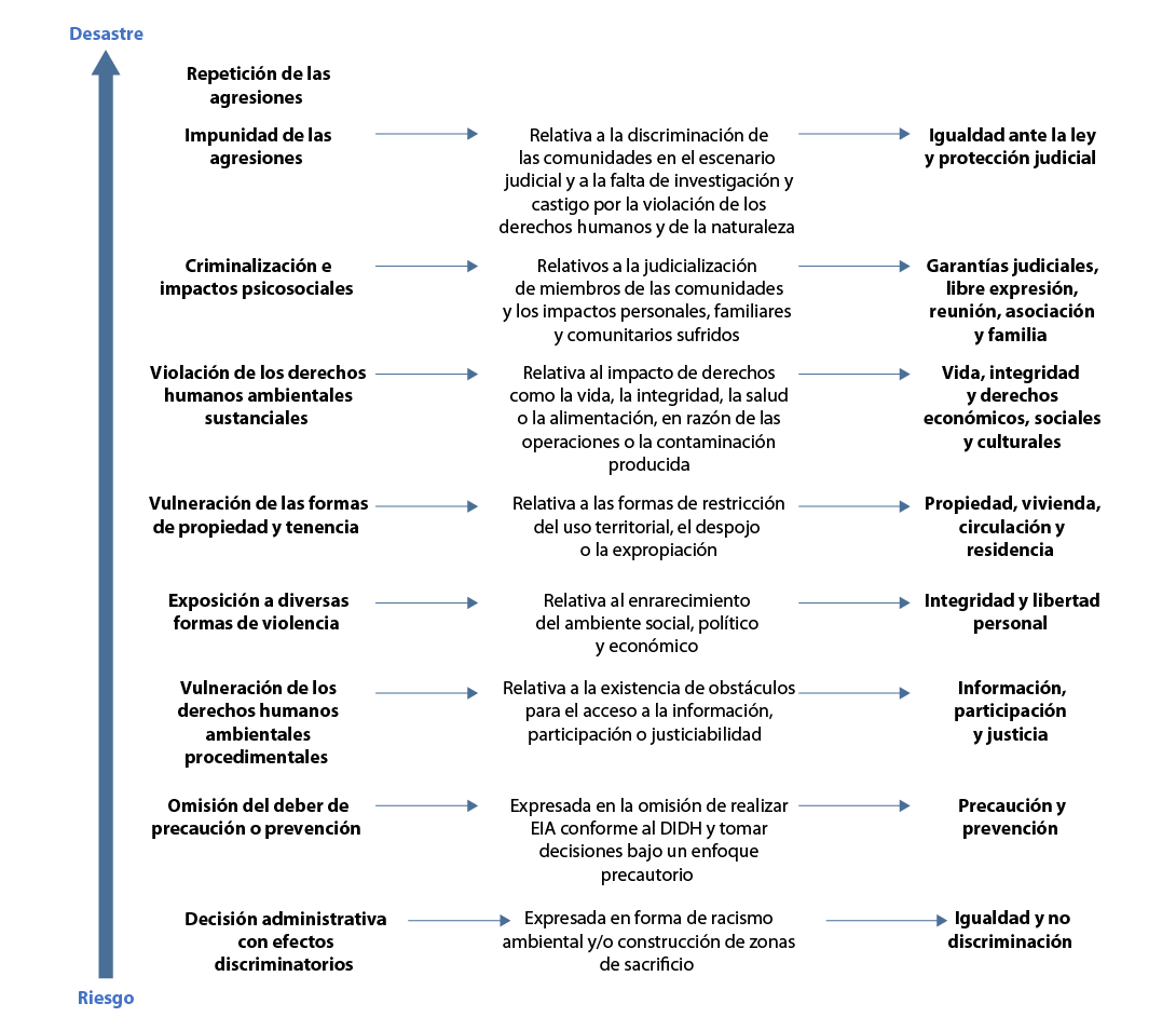 Puede decirse que un escenario sustentable se da cuando el Estado aplica de buena fe los estándares del DIDH y, en caso de proceder a la restricción de derechos colectivos y de la naturaleza, adopta salvaguardas oportunas, participativas, restaurativas y justas. En cambio, el escenario empieza a perfilar un riesgo cuando las comunidades padecen violaciones de derechos humanos y el medio ambiente se ve afectado. Aquí el acento se pone en el hecho de que el Estado falla por el retardo en la adopción de medidas de protección, porque exhibe discriminación en sus acciones u omisiones y apela a diversas formas de violencia e impunidad.