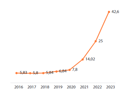 A partir de 2019 inicia el incremento de la tasa (6,84). Esta data es previa a la declaratoria de la pandemia por COVID-19 en Ecuador y el mundo, momento que marca el inicio de un drástico aumento de la mano de políticas neoliberales en los gobiernos de Lenín Moreno y de Guillermo Lasso, cuando la tasa se duplicó porcentualmente cada año. En 2021 fue de 14,02 y en 2022,[xvii] de 25, con 4603 muertes violentas. Por su parte, 2023 cerró con 7592 muertes violentas y una tasa de homicidios intencionales de 42,6 por cada 100 000 habitantes,[xviii] la más alta de Sudamérica.
