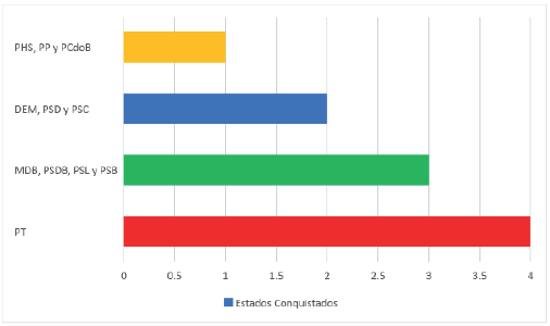 Esto demuestra un pequeño pero significativo ascenso de otros partidos en el juego político de la Federación brasileña, para conquistar estados con una gran población como el caso de Río de Janeiro y Minas Gerais. Sin embargo, el partido que más eligió gobernadores de los estados fue el PT que obtuvo cuatro representaciones. En el gráfico 4 se puede observar de forma más sencilla el número de Estados con los que cuenta cada partido.
