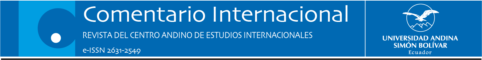 1. Politólogo-investigador, Universidad Nacional de Colombia. Magíster en Relaciones Internacionales, mención en Negociaciones Internacionales y Manejo de Conflictos, Universidad Andina Simón Bolívar, Sede Ecuador (UASB-E). aemadrigalg@upn.edu.co.