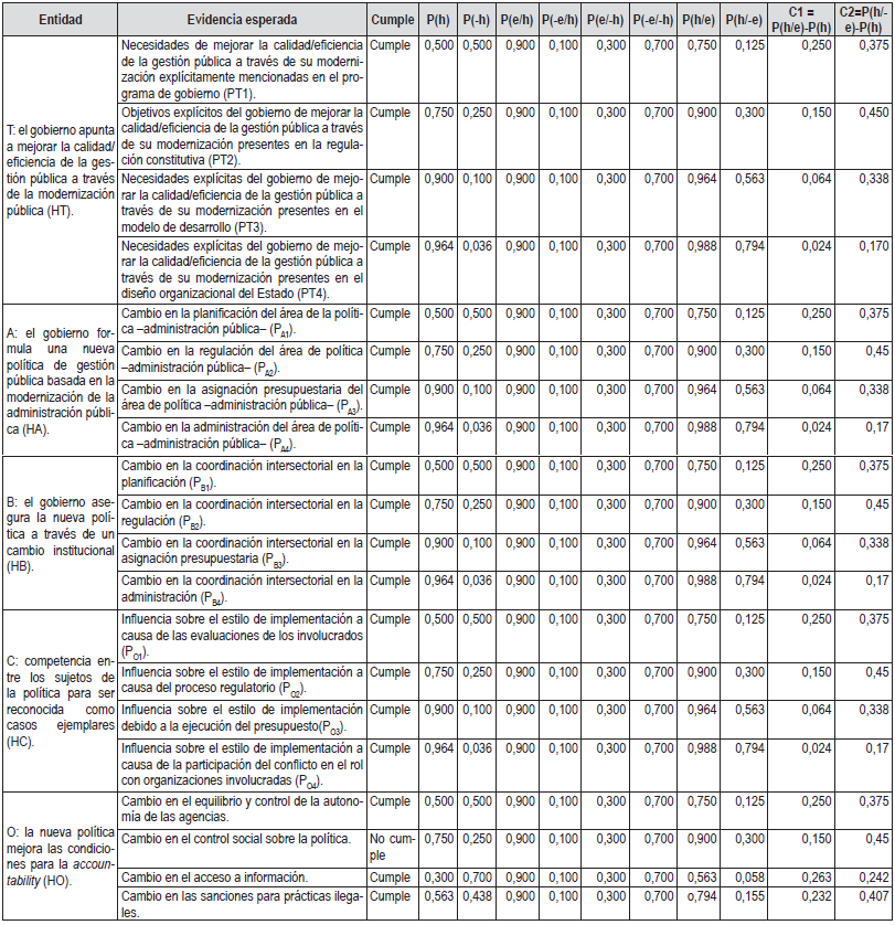 Para realizar una de estas pruebas, por ejemplo, la de aro, es necesario la aplicación de esta a todos los instrumentos de una política, es decir, los de nodalidad, autoridad, tesoro y organización, para cada uno de los cuales se han definido evidencias. Se considera una alta certeza cuando se obtiene una probabilidad de que exista la evidencia y exista la entidad analizada de 90% (p (e | h) = 0,9) y una baja exclusividad cuando la probabilidad de que exista la evidencia, pero no se cumpla la entidad analizada del 10% (p (e | ¬h) = 0,1) (Fontaine, Narváez y Fuentes 2018).