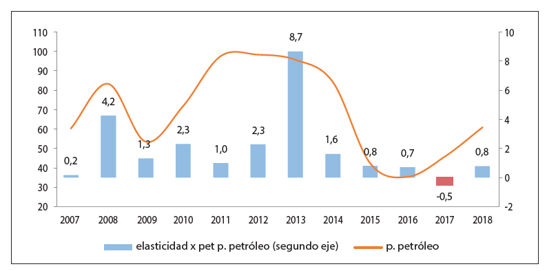 Por otra parte, mediante el cálculo de la elasticidad de los ingresos fiscales por exportaciones petroleras respecto de los precios del hidrocarburo, se observa entre 2007 y 2018, principalmente, valores elásticos, excepto durante el período 2015-2018. Esto denota que la respuesta de los ingresos petroleros usualmente ha sido muy sensible a las variaciones de los precios del petróleo (gráfico 3).
