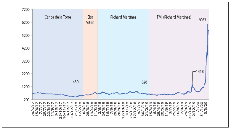 Lo que es importante evidenciar es el cambio de trayectoria desde marzo de 2018, con un riesgo país en ascenso, debido en alguna medida a las señales políticas generadas alrededor de la deuda pública, como se explicó anteriormente. Pero lo más destacable es que este ascenso en la percepción de riesgo coincide con el repunte de los precios internacionales del petróleo hasta el tercer trimestre del año ya con un tercer ministro en el cargo. De ahí en adelante, hasta diciembre de 2018, el riesgo país continuó su ascenso, para un posterior decrecimiento menor coincidente con la suscripción de un acuerdo con el FMI, que luego se revertiría sobrepasando los 1000 puntos para octubre de 2019 y alcanzando el récord histórico de 6063 a fines de marzo de 2020.