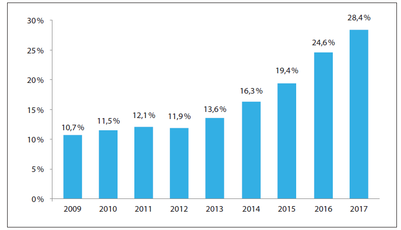 Con la aplicación de estos lineamientos metodológicos, la deuda pública consolidada del Ecuador se incrementó de 10,7 % del PIB en 2009 a 28,4 % al cierre de 2017, por lo que su nivel se mantuvo en el marco de la normativa vigente a esta última fecha (gráfico 6).