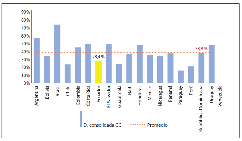 Ya desde un análisis técnico, evaluación correcta de variables económicas se realiza en términos relativos como proporción del PIB o de otras variables relevantes, pero nunca en términos absolutos y con calificativos. En el caso de la deuda pública, medida en relación con el PIB, incluso su evaluación adecuada debería realizarse comparándola con otros países o entre distintos períodos. Por ello, para precisamente relativizar su magnitud en comparación con otros países de la región, se aprecia que a 2017 la deuda consolidada del gobierno central del Ecuador como porcentaje del PIB con 28,4 %, no alcanzaba siquiera la media de América Latina de 38,8 % (gráfico 7).