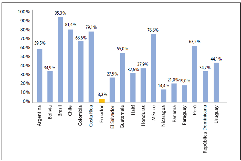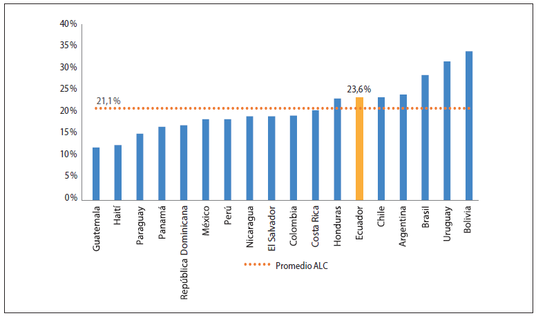 Como se evidenció en líneas anteriores, desde ciertos sectores de opinión se pretende posicionar la idea de que el Estado ecuatoriano es obeso (Carrera 2020), con la utilización de este adjetivo de forma absoluta sin ninguna comparación o relativización. Es evidente que el uso de calificativos como este, que en el imaginario ciudadano tienen connotaciones negativas, obedece a una intencionalidad política y no a una descripción adecuada de la realidad. Al efectuarse el contraste correspondiente del tamaño del Estado ecuatoriano respecto del conjunto de economías de América Latina y el Caribe, la CEPAL, para 2017 demuestra lo siguiente: