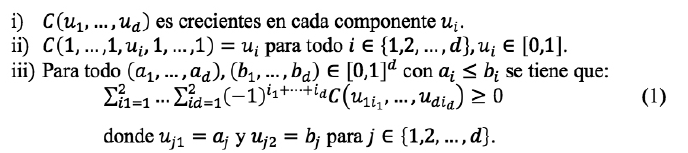 Definición: una cópula d-dimensional es una función de distribución multivariada, C: [0,1]d ➝ [0,1] donde, sus distribuciones marginales (individuales) son uniformes estándar U1 ~ U (0,1) i = 1, 2... d.