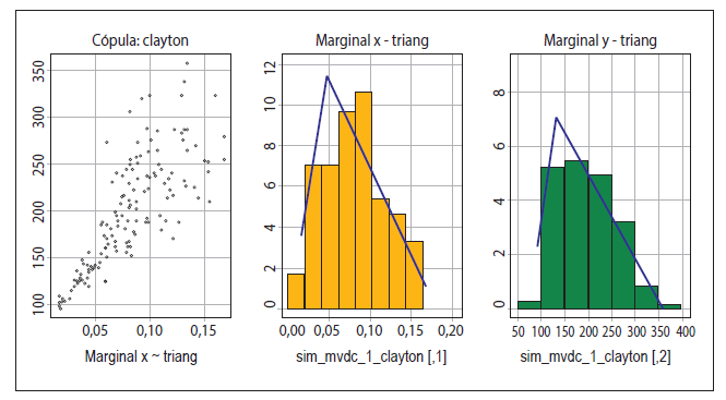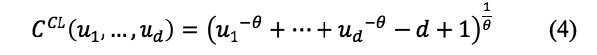Por su parte, Luo, Lu y Li (2015) demostraron que la cópula de Clayton es la más apropiada para describir alta dependencia en la cola, con ello estimaron un modelo VaR que mide con precisión el riesgo tanto en condiciones normales como en períodos de crisis; mientras que, Szetela, Mentel y Brożyna (2019) destacaron la ventaja de la cópula para modelar el incumplimiento con datos de alta dimensión y dependencia compleja.