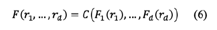 Teorema de Sklar, sea F (r1,... rd) la función de distribución conjunta de las variables aleatorias R1... Rd con funciones de distribución marginales F1 (r1)... Fd (rd). Existe una función C: [0,1]d ➝ [0,1] tal que para todo r1... rd: