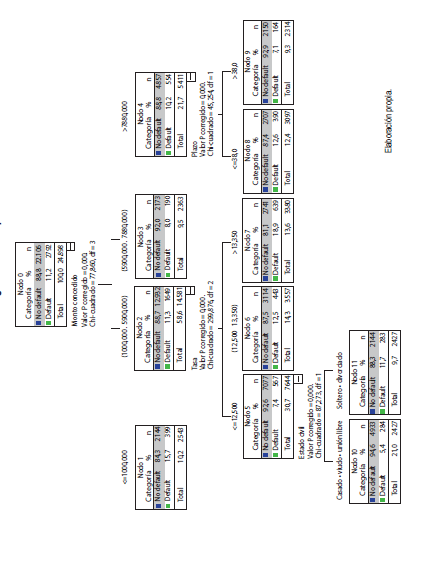 Tomando como variable dependiente el incumplimiento Yi y como variables independientes, el monto, plazo, tasa de interés y estado civil, utilizando la razón de verosimilitud y como categoría objetivo el default Yi = 1, el CHAID identificó ocho grupos homogéneos como se demuestra en los nodos terminales del gráfico 1.