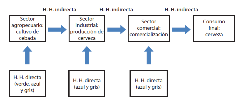 Por otro lado, la HH indirecta engloba dentro de su evaluación a los tres tipos de huellas mencionados anteriormente, y se refiere al volumen de agua incorporada o contaminada en toda la cadena de producción de un producto. Para citar un ejemplo en el que se pueda apreciar de mejor manera la HH indirecta, se puede presentar la producción de cerveza, representada en la figura 1. En primer lugar, durante el crecimiento de la cebada utilizada en su producción se ha consumido y contaminado agua. En segunda instancia, se ha utilizado y contaminado agua durante el proceso de producción en sí mismo. En tercera instancia, se ha usado y consumido agua (aunque en menor medida) en el proceso de comercialización del producto terminado, hasta que finalmente el producto, en este caso la cerveza, llega al consumidor final.