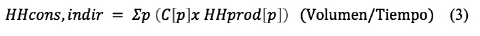 Donde C[p] representa el consumo de un producto p medido en (unidades de producto/tiempo), y HHprod [p] es la huella hídrica del producto p medido en volumen de agua/unidad de producto. El conjunto de productos consumidos por un individuo representará el HH indirecta de un consumidor.