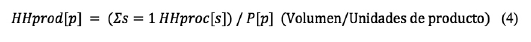 En donde H. H.proc[s] es la huella hídrica del proceso en el apartado s, es decir, en una fase determinada del proceso productivo o cadena de producción, medido en volumen de agua/tiempo, y P[p] es la cantidad de producción generada medida en unidades del producto/tiempo.