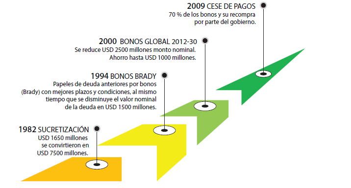En este mismo lapso se dieron algunos hechos relevantes que constituyeron puntos de inflexión en la dinámica del endeudamiento del país; en los gráficos siguientes (hitos del endeudamiento), se registran estos hechos relevantes: