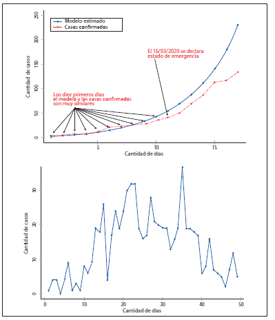 La figura 1 muestra el análisis con los datos de los primeros 17 días con el modelo exponencial, el cual evidencia la posible tendencia que tomaría el comportamiento del coronavirus en Costa Rica. Según se aprecia en la figura 1, en los primeros 10 días se marcó una tendencia exponencial: sin embargo, con la declaratoria del estado de emergencia nacional y de confinamiento a partir del día 11, la tendencia de casos reales se alejó de la forma exponencial, lo cual sugirió un potencial efecto de las medidas sanitarias y por ende la presencia de un comportamiento logístico. Este hecho se observa en la curva de casos diarios observados, la cual presenta un crecimiento hasta el día 22 o 23 y luego decrece hasta el día 50.