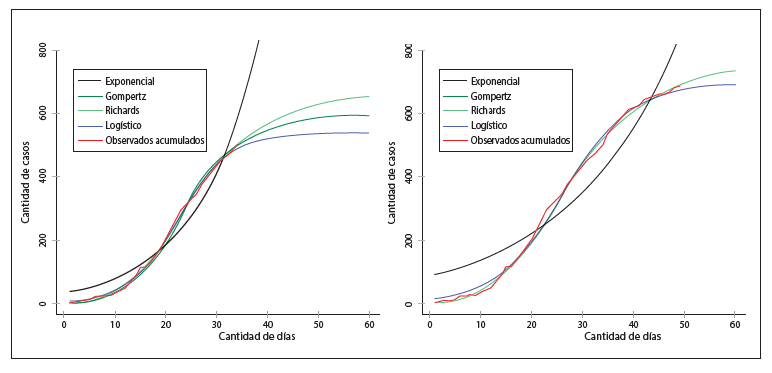 Al día 34, el crecimiento de los datos se ubica sobre el escenario intermedio representado por la curva de Gompertz, mientras que al día 40 los casos acumulados se mantuvieron sobre la curva de Richards y al día 49 retomó la forma de Gompertz. El mantenimiento de la forma sigmoide es un indicativo de que las medidas adoptadas por el Ministerio de Salud mantuvieron cierto control en el crecimiento de los casos.