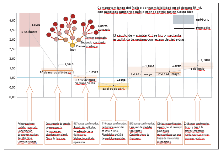 Las principales recomendaciones plasmadas en los informes evidenciaron que las intervenciones realizadas por el Ministerio de Salud de Costa Rica modificaron el comportamiento exponencial del contagio a una forma logística, lo cual se reflejó en la capacidad de dar atención a los pacientes con la COVID-19 en las redes hospitalarias. También el equipo de especialistas calculó el número de reproducibilidad en etapas iniciales de la pandemia (Nishiura 2013) demostrando que el valor funcionaba como evidencia de la descripción de la rapidez de la transmisión del virus entre personas.