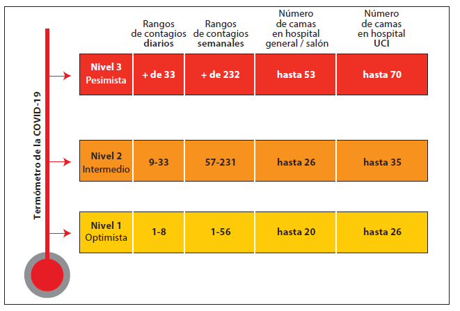 La figura 4 muestra un ejemplo de la optimización de la información mediante gráficos. El gráfico de la figura 4 presenta un panel de termómetro que representa los límites de los distintos niveles de alerta según la cantidad de casos diarios, semanales y ocupación de camas. Por ejemplo, durante los primeros tres meses una cantidad de casos superior a 33 y una ocupación de camas mayor a 70 marcó la caracterización en un nivel 3 de alerta.