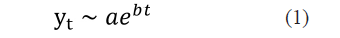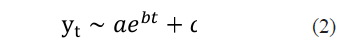 donde t representa el consecutivo de días y y es la variable dependiente que representa la cantidad de casos acumulados y los parámetros a y b describen el comportamiento inicial y la rapidez del crecimiento, respectivamente. Otra versión del modelo exponencial que incluye un parámetro adicional se expresa como
