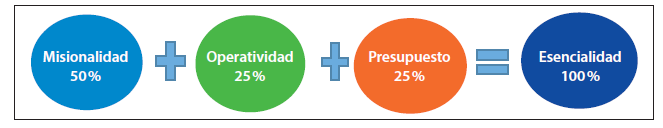 Para definir la esencialidad de los servicios identificados, se utilizó una matriz multicriterio con el propósito de ponderar el peso de cada uno de los criterios definidos anteriormente. Para esto, se utilizó una escala del uno al cinco para dar una calificación en los criterios de misionalidad, operatividad y presupuesto en cada uno de los servicios que ofrece la UCR-SO. La ponderación de los criterios de esencialidad utilizada en la matriz multicriterio se encuentra detallada en la figura 1.