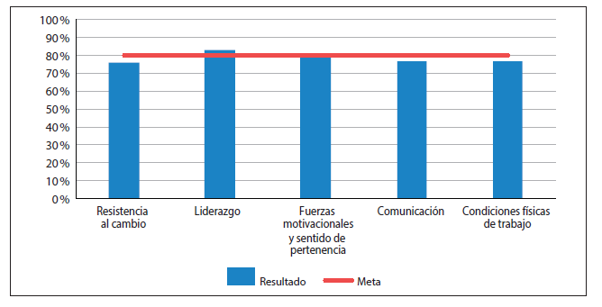 La figura 7 resume los resultados del censo realizado a los encargados de cada coordinación o departamento. Como se puede observar, la variable de liderazgo muestra una mayor aceptación en las preguntas planteadas con un 83 %, seguida de la variable de fuerzas motivacionales y sentido de pertinencia que alcanza un 80 %. Ambas se consideran aceptables según el límite planteado en la metodología.