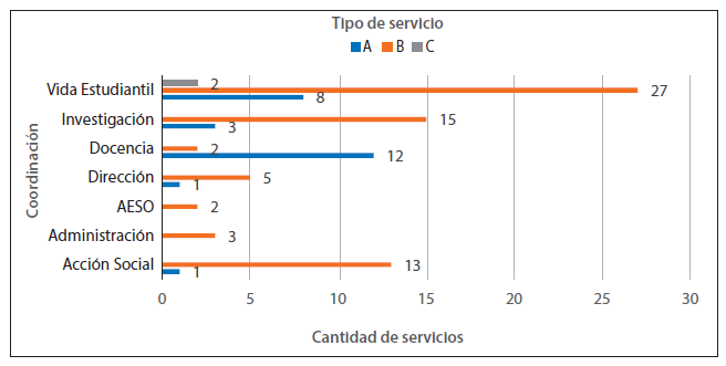 En la figura 8 se puede observar que los servicios A se encentran distribuidos en las coordinaciones de docencia, vida estudiantil, investigación, dirección y acción social. Por su parte, los 67 servicios con clasificación B están distribuidos en todas las coordinaciones bajo estudio y la coordinación de vida estudiantil es la única que tiene servicios con clasificación C.