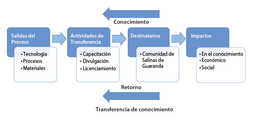 Este proceso de transferencia de conocimiento científico y tecnológico, tácito y explícito, constituyó la base fundamental para la trasferencia de tecnologías, innovación y habilidades de la comunidad Salinera, para la construcción de la quesera principal con la finalidad de mitigar los impactos económicos y sociales propios de la comunidad, como se representa en la figura 1.