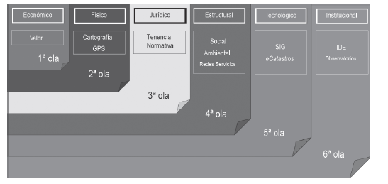 Los aspectos geotecnológicos del catastro se van incorporando con diferentes velocidades a través de diversas herramientas. En los catastros dependientes de secretarías o direcciones de planeamiento es más frecuente encontrar plataformas para el desarrollo de estudios específicos. No obstante, en aquellos que dependen de secretarías de finanzas, hacienda o economía, la prioridad es la administración de datos alfanuméricos con fines tributarios, perdiendo gran parte del potencial de análisis espacial que los datos catastrales tienen. Estructurar un SIG coloca a un catastro municipal en la 5a. ola, pero no aún en la 6a. (ver figura 3).
