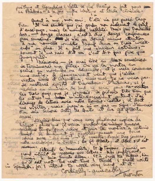Alfredo Pareja Diezcanseco y Enrique Gil Gilbert no fueron los únicos miembros del grupo a los que Wilder conoció en Guayaquil. Marlene Dávalos nos dio un testimonio de su hermana mayor, Adda Teresa, que recordaba que su padre solía recibir en su casa a “este señor vestido todo de blanco”; y Anthony del Campo, hijo de Adda Teresa, nos dio generosamente una copia de dos cartas inéditas, del 16 de agosto de 1941 y el 21 de marzo de 1942, que atestiguan la relación amistosa de Wilder con Demetrio Aguilera Malta, una relación que ciertamente comenzó durante esta estancia de abril de 1941. 9 Estas dos cartas tratan principalmente de literatura. Wilder las escribió en francés porque, dice, su inglés era demasiado “complicado y enrevesado”, y su español era insuficiente.