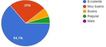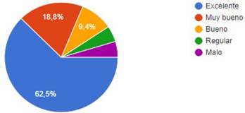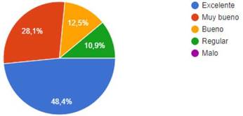 Fig. 1. ¿Cómo fue su experiencia con el EVA con respecto a las indicaciones de uso y anuncios? Elaboración: Propia. La Figura 2 representa la percepción sobre la calidad de los simuladores relativa a la evaluación en línea. Se observa que el 48,4% de los encuestados la considera excelente, el 28.1% muy buena, el 12.5% buena y el 10.9% regular. Ningún encuestado tiene una percepción mala para este componente.