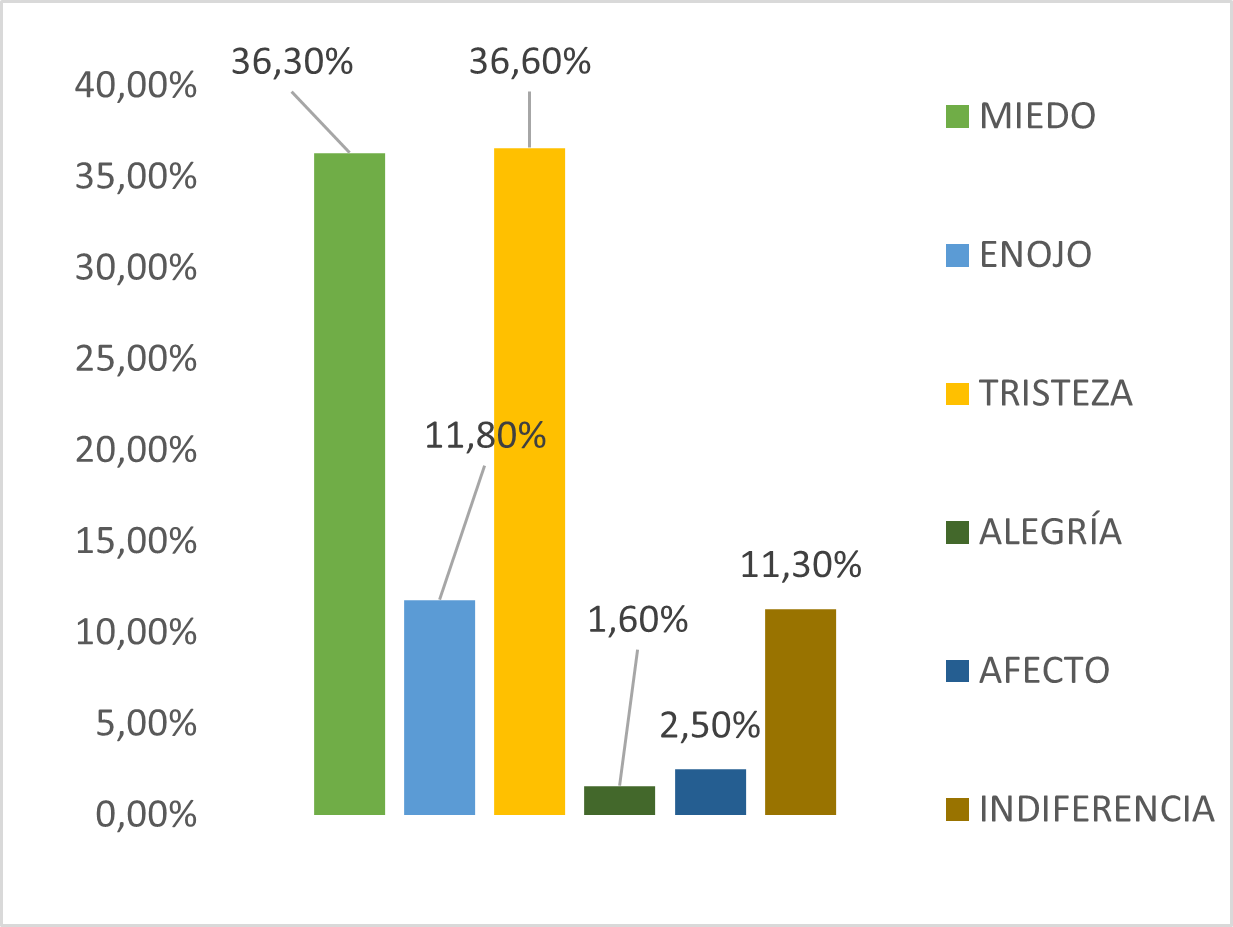 La siguiente pregunta fue sobre el sentimiento durante el tiempo de la alerta sanitaria por el coronavirus (Figura 2). Ahí hay un cambio, primero de emoción inicial que hemos visto que fue miedo, a sentimiento, en el sentido ya expuesto de su permanencia en el tiempo (Damasio, 2006), y segundo, se muestra la transición del miedo (36.30%) a la tristeza (36.60 %), si bien hay que reconocer que el primero sigue siendo importante pues es más de un tercio del estudiantado participante. En todo caso, lo que destaca es que dos terceras partes están entre la tristeza y el miedo, un tercio cada una, también algo de indiferencia, pero a bastante distancia. Miedo y tristeza que se relacionan con el síndrome de estrés postraumático, así como es posible relacionarlos con el síndrome de fatiga crónica, que ya se definieron con anterioridad, y cuyos síntomas se observarán en los testimonios expuestos con posterioridad, según los testimonios recabados. Veamos qué es la tristeza. Tristeza, se trata de retiro o reintegración personal, introspección. […] tiene que ver con una sensación de pérdida o de desilusión que nos permite retirarnos hacia nosotros mismos. Es de una tonalidad desagradable y de menor energía que las otras, si no la experimentáramos adecuadamente no podríamos retirarnos para posteriormente seguir buscando la satisfacción de nuestras necesidades en otro lugar. Natural ante la pérdida o la decepción. “Un fracaso, un duelo, una mudanza, una situación que produce la sensación de no ser amado” (Filliozat, 2007, p. 233). Surge por una pérdida, invita al retiro y al dolor, subraya la carencia. No confundir con depresión, la tristeza es positiva, la depresión envuelve en una espiral negativa. No obstante, si se simplificara, en algunos puntos contienen tonalidades parecidas, con la pérdida y el duelo que el ser humano necesita transitar para seguir adelante en la vida.