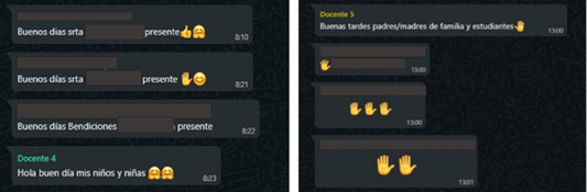 La primera práctica observada es una simulación de aula presencial que las docentes hacen en sus interacciones con estudiantes y padres en los grupos de WhatsApp. Se mantienen varias convenciones de una interacción áulica. Las docentes saludan a los estudiantes y padres y estos responden como si estuviesen en un aula. Este saludo ocurre en la mañana o la tarde, según si es jornada matutina o vespertina. Algunos estudiantes y padres saludan, indican estar “presente” o envían el ícono de una mano alzada, emulando la toma de asistencia. La Figura 1 presenta los saludos de dos docentes y la respuesta de los estudiantes.
