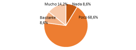 Respecto a la retroalimentación recibida por parte de los docentes, resultó igualmente frecuente la opción poca que la opción bastante, alcanzando ambas una frecuencia del 31,4 %, lo cual permite inferir un resultado variable según el docente a cargo. El 48,6 % indicó que el aula virtual estaba bien organizada, seguida de un 28,6 % que indicó que estaba muy organizada. En cuanto a las evaluaciones, el 48,6 % consideró que la metodología fue bastante adecuada y el 37,1 % que los tiempos asignados para las mismas fueron escasos, siendo estas las opciones con frecuencias más elevadas para las preguntas correspondientes.