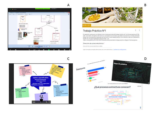 Fig. 1. Recursos y herramientas didácticas implementadas en el cruso de Farmacognosia 2020 para los temas de ‘Extracción’ y ‘Grupos Fitoquímicos I’. A: resolución de problemas en grupo utilizando PowerPoint. B: Formularios de Google utilizados para el Trabajo Práctico n.° 1 de procesos extractivos. C: Utilización de pizarra digital. D: implementación de encuestas en línea.