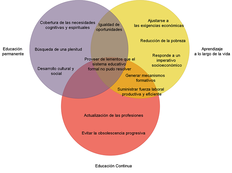 Las formas que han tomado la educación y el aprendizaje son diversas. Términos como andragogía o educación a distancia son hoy en día conceptos que han permeado en el imaginario colectivo y se han instalado en la terminología educativa. Tal proliferación de conceptos propicia que exista confusión semántica y se corre el riesgo de emplearlos de forma indiferenciada. Tal es el caso de la educación continua, educación permanente y aprendizaje a lo largo de la vida, conceptos que suelen asumirse erróneamente como sinónimos cuando existen acepciones que los alejan diametralmente. Sin embargo, existe entre ellos aproximaciones conceptuales que propician esta ambigüedad.