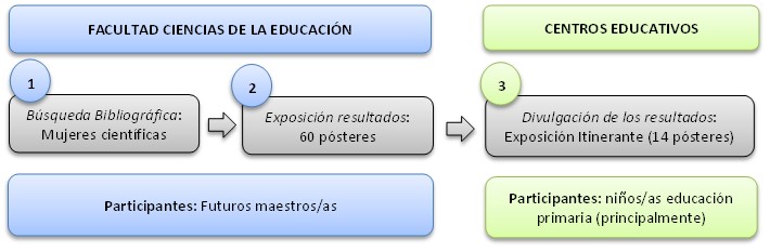 La experiencia llevada a cabo en los centros educativos se compone principalmente de dos actuaciones didácticas: exposición itinerante de las mujeres científicas a lo largo de la historia y charla-taller con las investigadoras, pertenecientes a dicho proyecto de innovación, de dos áreas de conocimiento distintas (Didáctica de las Ciencias Experimentales y Biología Celular). En particular, la experiencia descrita en este trabajo se corresponde a la realizada en el CEIP Santa Teresa de Jesús con un total de 86 estudiantes de Educación Primaria de quinto y sexto curso (9-11 años).