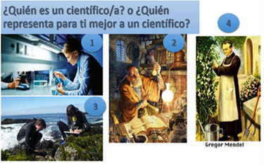 Debate. Formulación de la pregunta: ¿Quién representa a un científico para ti? Las cuatro imágenes seleccionadas representan personas realizando actividad científica en distintos contextos laborales e históricos (Imagen 1: prototipo de científico en laboratorio con bata; imagen 2: visión “mágica” de la labor científica; imagen 3: actividad científica de campo; e imagen 4: Gregor Mendel, ciencia y creencias religiosas). |