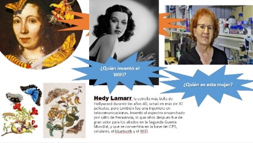 La segunda diapositiva nos aproxima a valorar la actividad científica desarrollada por mujeres a lo largo de la historia. Comenzamos con la científica María Sybilla (recogida en la exposición itinerante), a quien por su contribución a la ciencia prestamos especial atención a partir del dibujo y para poner en valor la relación entre ciencia y arte. Seguidamente, se muestra la fotografía de Hedy Lamarr, con la que suelen quedar muy impresionados por poder ejercer ‘dos profesiones’ tan distintas como actriz y científica. Finalmente, se presenta la imagen de la científica española Margarita del Val, que actualmente es portavoz en las noticias de España sobre la actualidad COVID-19. A pesar de ser Margarita del Val una científica muy televisiva y popular, ningún estudiante fue capaz de reconocerla.