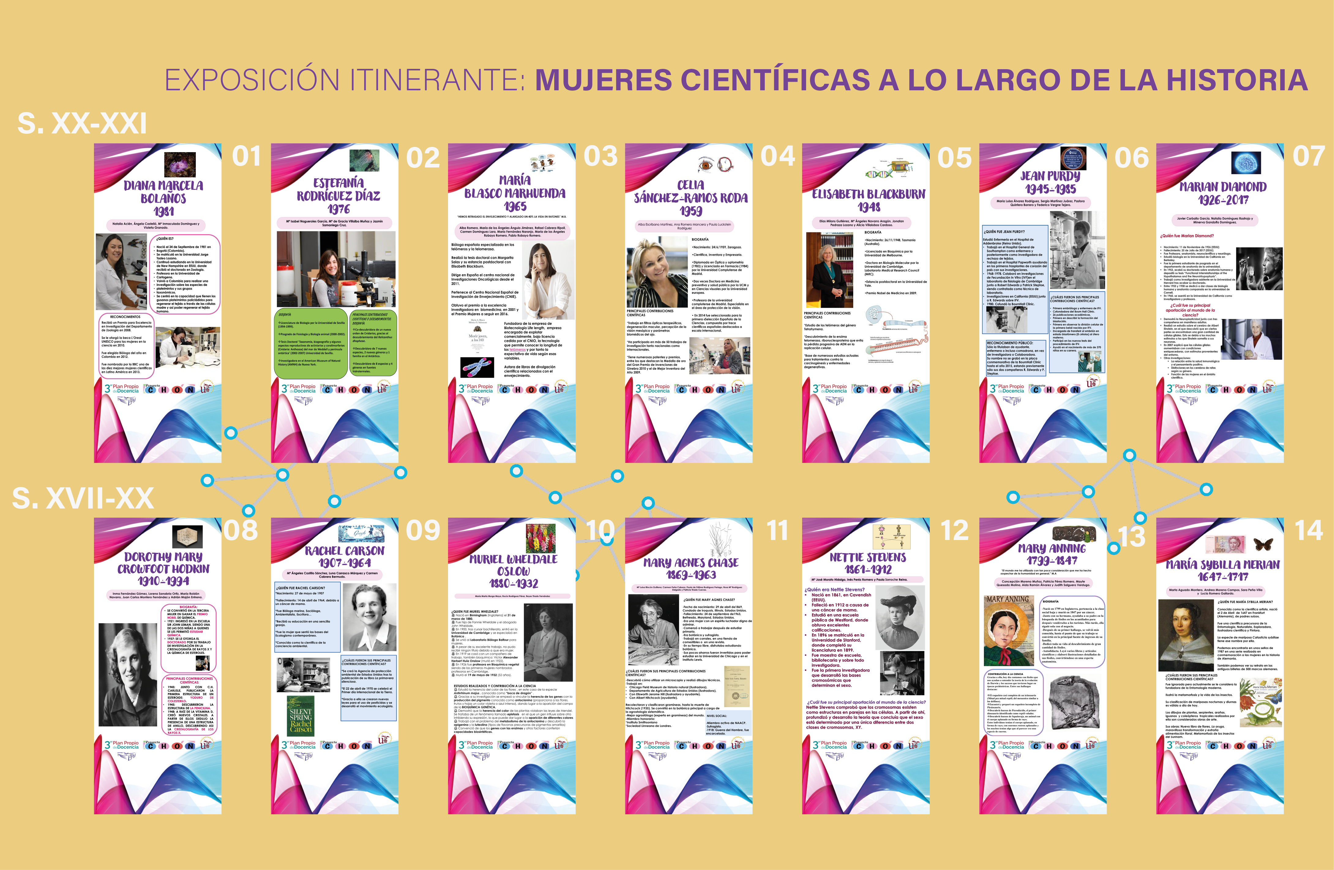 Como se ha expuesto anteriormente, como resultado del proyecto de innovación docente CHON se diseñaron, en formato de enaras expositivas (43 cm x 100 cm), 14 pósteres que intentan recoger en forma de línea de tiempo el recorrido científico de las mujeres a lo largo de la historia. La figura 2 recoge esta exposición ordenada cronológicamente desde las científicas actuales, comenzando por la colombiana Daniela Marcela Bolaños (parte superior e izquierda de la imagen), hasta la alemana María Sybilla Merian del siglo XVII (parte inferior a la derecha de la imagen). Igualmente, se exponen las biografías de Estefanía Rodríguez Díaz (biología animal), María Blasco Marhuenda (biología celular y molecular), Celia Sánchez-Ramos Roda (farmacia), Elisabeth Blackburn (bioquímica), Jean Purdy (medicina), Marian Diamond (neurología), Mary Agnes Chase (botánica), Dorothy Mary Crowfoot Hodgkin (química), Muriel Wheldale Oslo (biología), Rachel Carson (ecología), Nattie Stevens (biología) y Mary Anning (paleontología).