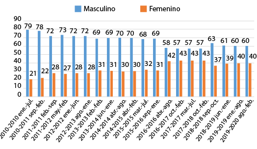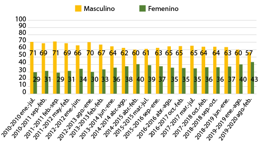 Fig. 3. Sexo de docentes de la Facultad de Filosofía, Letras y Ciencias de la Educación, 2010-2020.