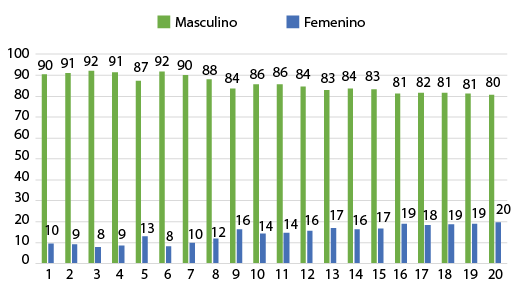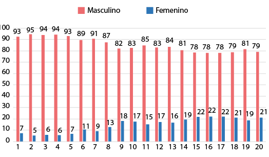 La presencia de mujeres docentes alterna entre un valor porcentual mínimo del 5 % hasta puntos máximos de 22 %. Estos datos reflejan que, durante estos períodos académicos, el porcentaje de mujeres no ha llegado a elevarse significativamente, y mucho menos cumplir con el valor porcentual de la paridad de género.