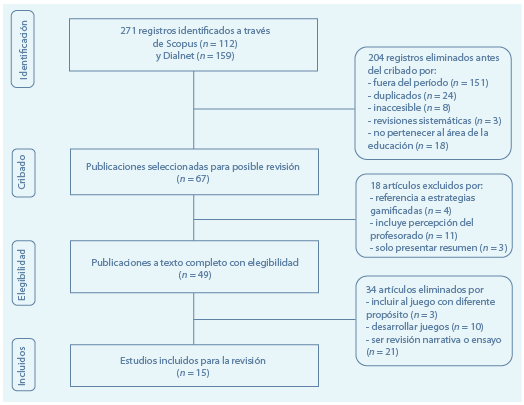 Como se puede apreciar, una vez realizada la consulta en las bases de datos se identificaron 271 registros (112 en Scopus y 159 en Dialnet), de los que se excluyeron aquellos que no correspondían al período indagado, los que eran inaccesibles, aquellos que remitían a revisiones sistemáticas o que no se correspondían con el área de educación, y los que estaban duplicados. Posteriormente, dos de las investigadoras revisaron el título, el resumen y las palabras claves de las 67 publicaciones resultantes, y volvieron a aplicar los criterios de exclusión. De esta manera se obtuvieron 49 registros para lectura atenta a texto completo, revisión que permitió eliminar aquellos que incluían el juego con diferentes propósitos a los que persigue este estudio, los que centraban la atención en el desarrollo de JD matemáticos y los que reflejaban una revisión narrativa o un ensayo. Cumplimentadas estas fases, se seleccionaron quince publicaciones para la revisión.