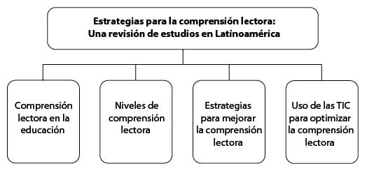 La revisión de los artículos permitió abordar la clasificación de los resultados, reflejada mediante el organizador gráfico descrito en la Figura 3. Los ítems —comprensión lectora en la educación, niveles, estrategias para mejorarla y uso de las TIC para optimizarla— se desarrollarán progresivamente y serán de gran utilidad para nuestra investigación.