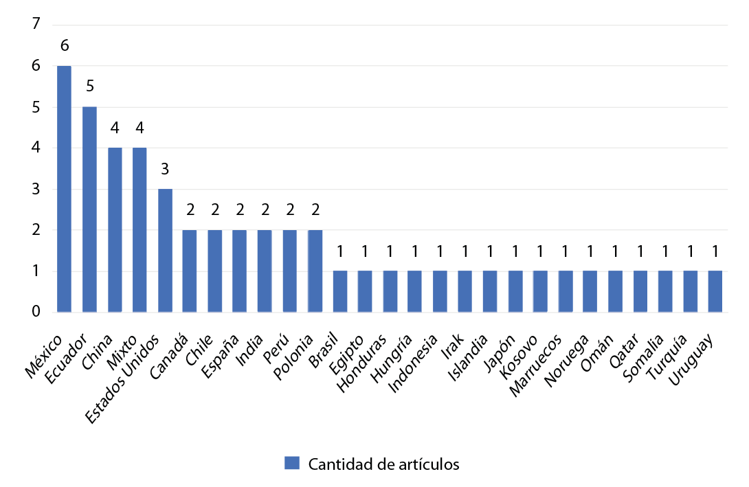 Las bases de datos utilizadas permitieron recopilar publicaciones de diversas partes del mundo. Sin embargo, dado que se utilizó la base de datos SciELO, se justifica el hecho de que una cantidad considerable pertenezca a países latinos, con México a la cabeza, con seis artículos (12 %). A este país lo siguen Ecuador, con cinco (10 %), y China, con cuatro (8 %). Además, cuatro de los artículos recopilados fueron considerados como mixtos, pues incluyeron a más de un país en su estudio.