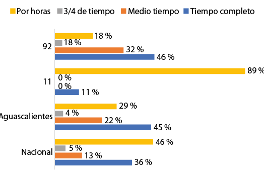 En la figura 1 se muestra que el porcentaje promedio de PTC en escuelas normales de Aguascalientes asciende a 45 %, cifra que está por encima de la media nacional (36 %). Sin embargo, hay diferencias marcadas entre escuelas: en un comparativo se puede ver que la escuela 92 tiene 46 % de su profesorado en esta condición y la 11, solo 11 %, dedicado exclusivamente a la gestión administrativa para puestos directivos y de coordinación. En esta escuela, el 89 % de los profesores está contratado por horas, lo que la coloca en una posición de desventaja para la conformación de cuerpos académicos y perjudica a su profesorado, pues no acceden al reconocimiento de PRODEP.