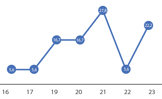 Las personas jóvenes participantes en este tipo de programas se encuentran en franjas de edad similares, principalmente debido a que los programas de apoyo a la transición a la vida adulta se dirigen a jóvenes de más de 16 años, principalmente de entre 18 y 23. Esto se debe a que los actuales sistemas de bienestar en Navarra y Euskadi abordan el reto de la emancipación juvenil por la dificultad de acceso al mercado laboral estable y a la vivienda, principalmente, lo cual supone una mayor dificultad para los y las jóvenes que no cuentan con referentes familiares en el territorio ni procesos de acompañamiento a personas extuteladas. Por tanto, la mayoría de participantes en los programas de mentoría relacional tienen 21 años (27,8 %), seguido de quienes tienen 23 (22,2 %); el resto de participantes oscila entre los 16 y 22 años.