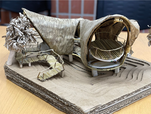Además, duplicar estructuras en el sistema estructural de la guadua invita a los estudiantes a poner sus habilidades prácticas a prueba y desarrollar una comprensión profunda de cómo los principios arquitectónicos se aplican para explorar volumétricamente la forma del objeto. Utilizar estos materiales les permite ahorrar considerablemente el uso de plástico, icopor y sus derivados, costosos y altamente contaminantes (Morales, 2021).