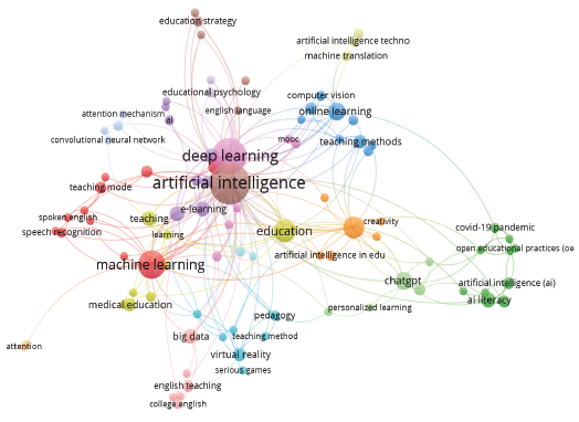 En el centro del mapa, los términos “artificial intelligence”, “deep learning”, “machine learning’ y “education” destacan como los conceptos más prominentes, lo que indica su relevancia en las investigaciones actuales. Estos términos están interconectados con una variedad de subtemas como “e-learning”, “teaching methods”, “virtual reality” y “chatgpt”, lo cual refleja la amplia gama de aplicaciones de la IA en contextos educativos. Clusters específicos, como el asociado a “machine learning” (en rojo), subrayan su uso en áreas como “teaching mode” y “speech recognition”, mientras que el cluster verde, relacionado con “chatgpt”, “personalized learning” y “ai literacy” resalta las implicaciones prácticas y teóricas emergentes de estas tecnologías en la educación.