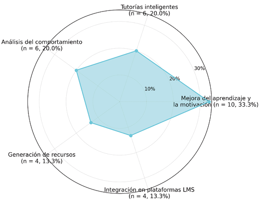 La categoría con mayor representación fue “mejora del aprendizaje y la motivación”, con n = 10 (33,3 %). Los estudios reportados abarcan desde el uso de algoritmos adaptativos6 hasta el diseño de experiencias de aprendizaje personalizadas, con resultados que indican una mejora en la atención y en el rendimiento académico.