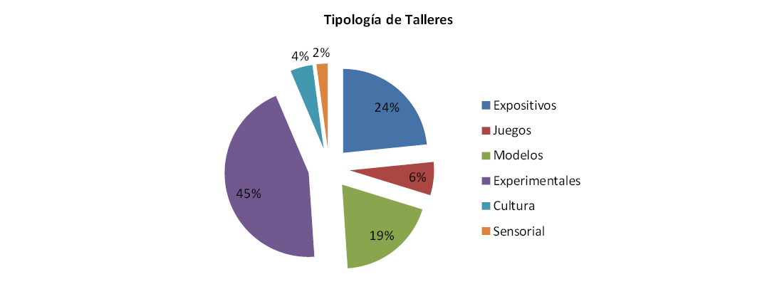 Por otro lado, en relación a la tipología de los talleres realizados ha sido muy variada en ambas clases, utilizando incluso en el mismo stand distintas formas de presentar los resultados. Algunos han sido de tipo expositivos (aquellos que a través de cartelería mostraban los resultados), juegos (los participantes interactuaban con los estudiantes para resolver algunos interrogantes), modelos (los estudiantes creaban modelos que representaban diferentes aspectos relacionados con el agua), experimentales (aquellos stands que mostraban en directo experiencias prácticas para resolver los interrogantes), cultura (aquellos que muestran aspectos relacionados con el arte y el agua o la música y el agua), sensoriales (aquellos en los que se fomentaba que los participantes realizaran alguna actividad a través de algún sentido concreto). A continuación, se presenta un resumen de los talleres realizados en las asignaturas que podemos ver representados porcentualmente en el Gráfico 3.